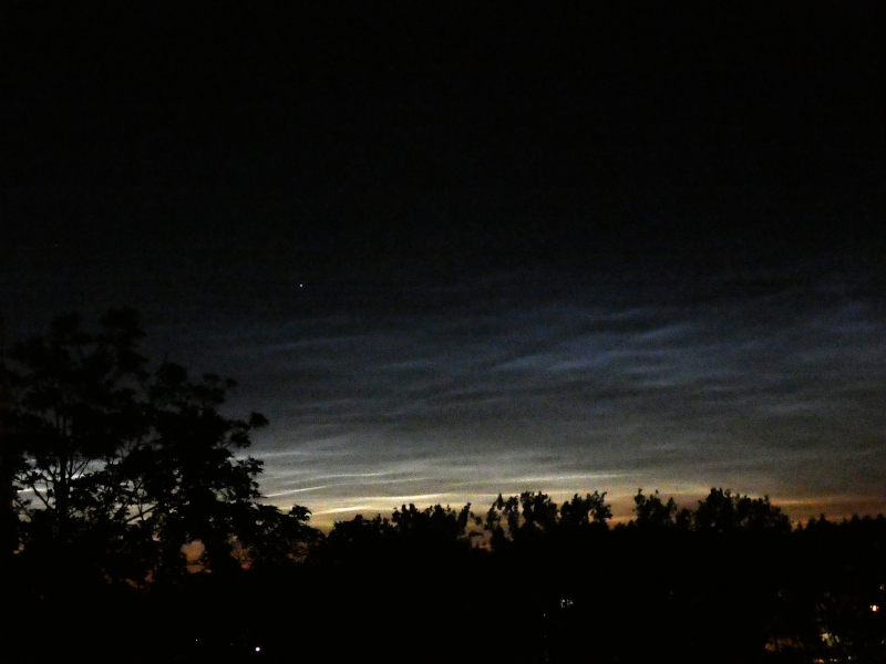 Von mir auch ein paar NLC-Bilder aus Bochum. Um kurz nach 23 Uhr sah ich noch einmal aus dem Nordfenster im Hausflur, um zu überprüfen, ob vielleicht Leuchtende Nachtwolken da wären. Nun, die Überprüfung fiel positiv aus: