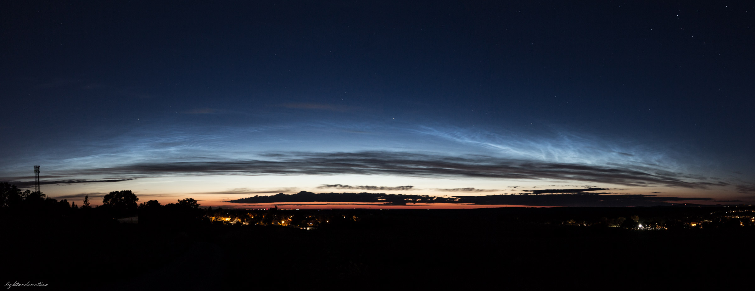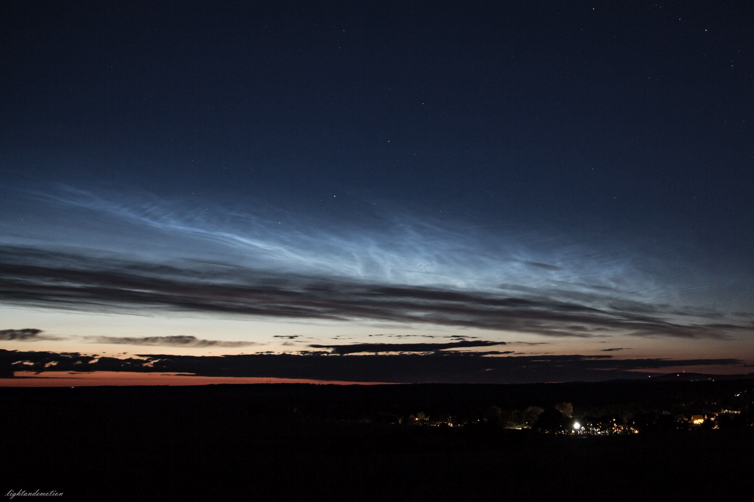 Als ich gegen halb 11 aus dem Haus ging, hingen da noch einige störende Zirren, wobei ich nicht ganz sicher war ob es welche waren. Ein Foto habe ich erstmal nicht gemacht, war ja auch eigentlich noch zu hell. Wenig später hing dann klar ein heller NLC-Streifen mit erheblicher Ausdehnung etwa auf Nordost, ich hatte aber Mühe, gegen die allgegenwärtig übertriebene Straßenbeleuchtung einen guten Blick zu bekommen. Von Westen zog dunkler Stratus auf.