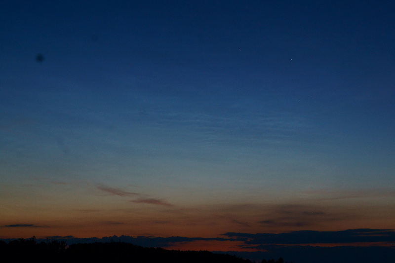 Auch hier bei Kirchhain waren die NLCs am Morgen schwach sichtbar. Sie hatten eine Ausdehnung von 310° bis 40° und eine Höhe von 15° bis 16° (etwas über Capella). Das Feld war sehr lichtschwach, nur an einigen Stellen mit Strukturen erreichte es Helligkeitsstufe 2. Die NLCs verblassten dann anschließend sehr schnell in der Morgendämmerung, einzig das Feld im Norden war noch bis etwa 4:20 MESZ sichtbar.