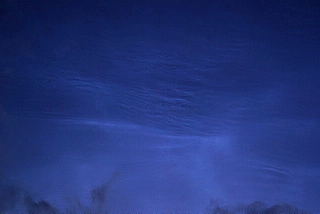 Ziemlich eindrucksvoll heute ... aber bei Weitem kein Ereignis wie letzte Woche. Helligkeit eben nicht >5 sondern eher 2-3. Sichere NLCs bis ca. 25° ... darüber zwar ein Schimmern, aber das waren wohl mehr niedrige Nebelstreifen; überhaupt lagen zumeist dichte Wolken in den unteren Schichten vor den NLCs.