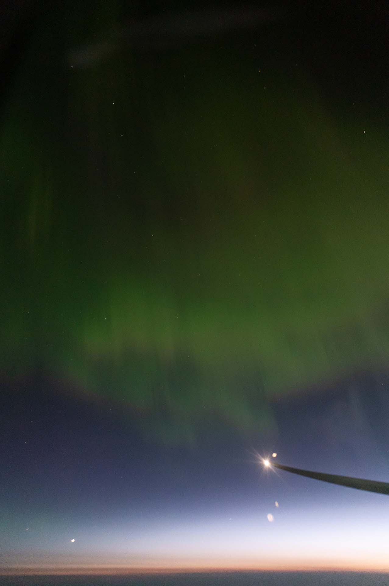 Die einsetzende Dämmerung hat sich schließlich schier endlos gezogen und hat auch nie geendet. Wir flogen zunächst nach Norden, anschließend weiter über Nordkanada und dem Süden Grönlands nach Europa. Wir waren quasi immer genau am Rand von Tag und Nacht. Irgendwo im südlichen Kanada - genau weiß ich es leider nicht, wahrscheinlich aber die Gegend um Winnipeg - gab es zunächst fotografisches, dann schwach visuelles Polarlicht.