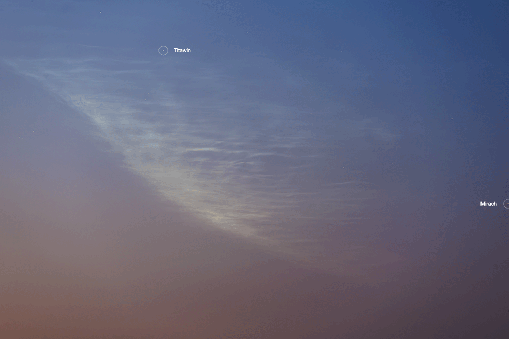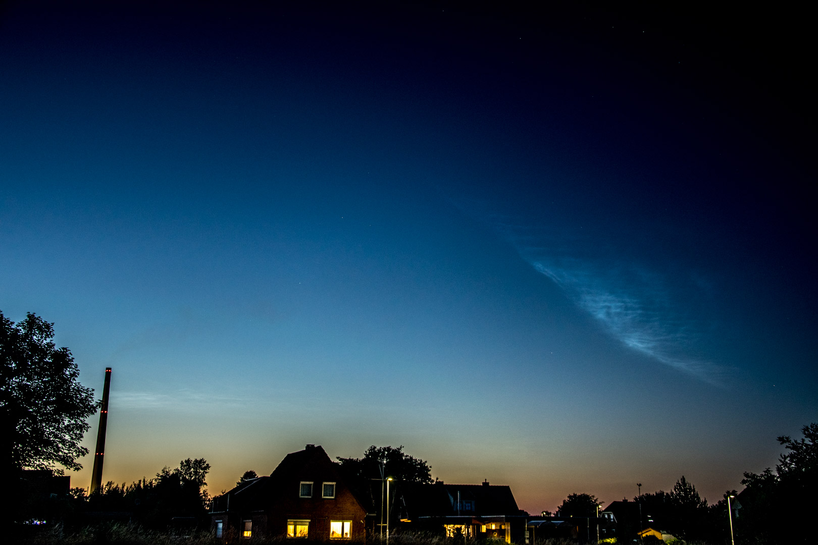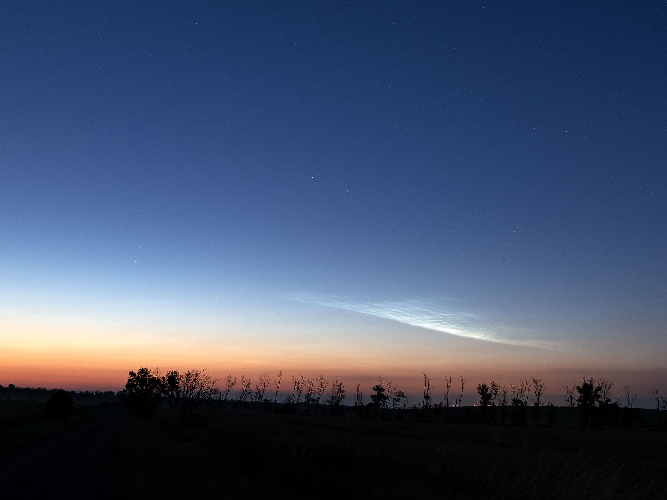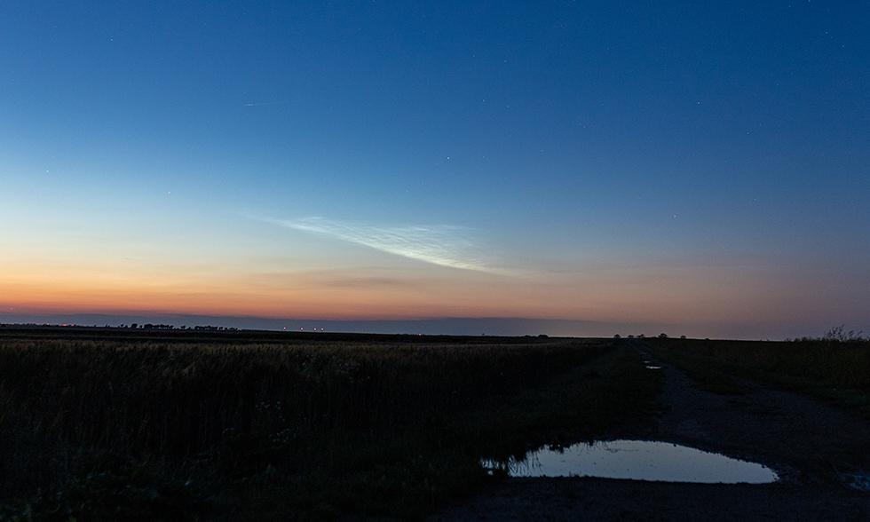 Mit dem bloßem Auge waren keine Strukturen zu erkennen, mit der Kamera ließen sich aber schöne Wellenformen festhalten. Eine halbe Stunde später deutete sich links davon ein Streifen an, der zuerst nur schwer von dem Dunst zu unterscheiden war. Mit der Kamera ließen sich aber auch hier feine Wellenstrukturen und Bewegungen nach Westen festhalten, sodass es sich hier auch um NLC gehandelt haben muss und kein "Schnodder" oder Kontrasteffekt war, der sonst den Horizont eintrübte. Der Streifen war dann auch noch zu erahnen, als die östlichere Struktur schon fürs Auge nicht mehr sichtbar war. Etwa gegen Mitternacht waren dann beide Formationen nicht mehr mit dem Auge auszumachen.