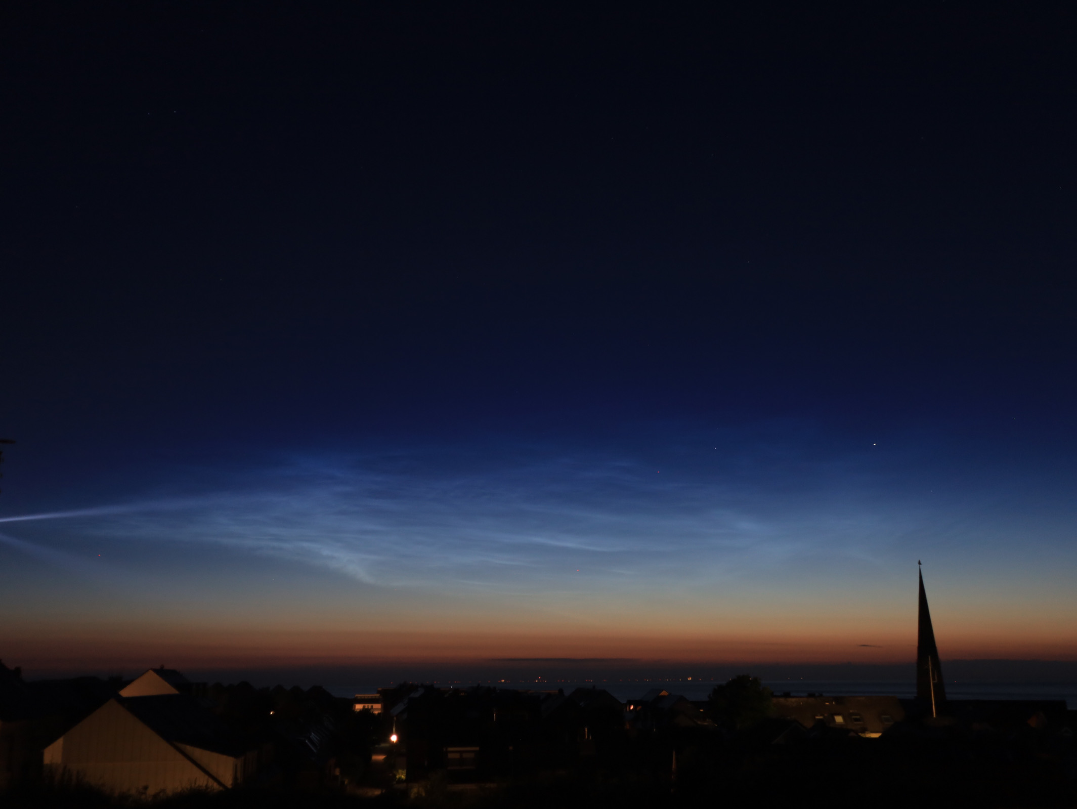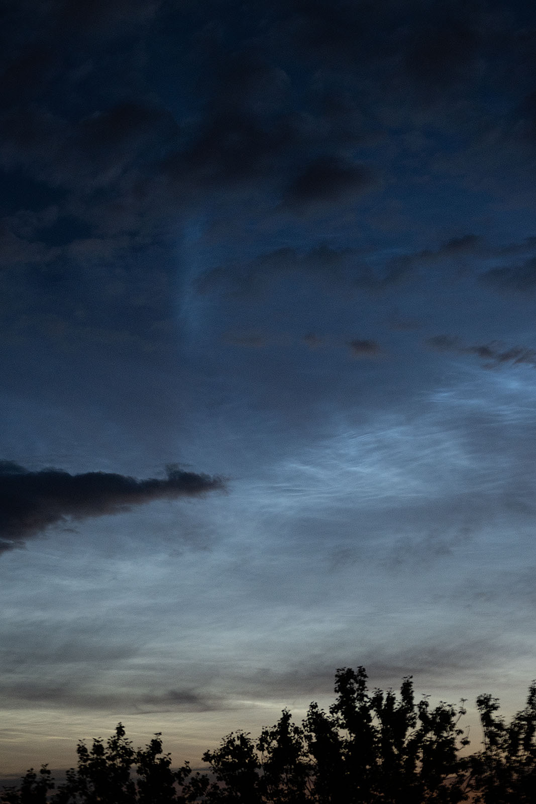 In der Berliner Innenstadt zeigten sich kurz vor 22:30Uhr MESZ NLC-"Rippen" in Wolkenlücken gen NNO, hochstehend. Bei einem Sonnenstand erst um die -6° sowie Zirren und anderem Gewölk schon erkennbar, da dürften diese NLC recht ausgeprägt sein.