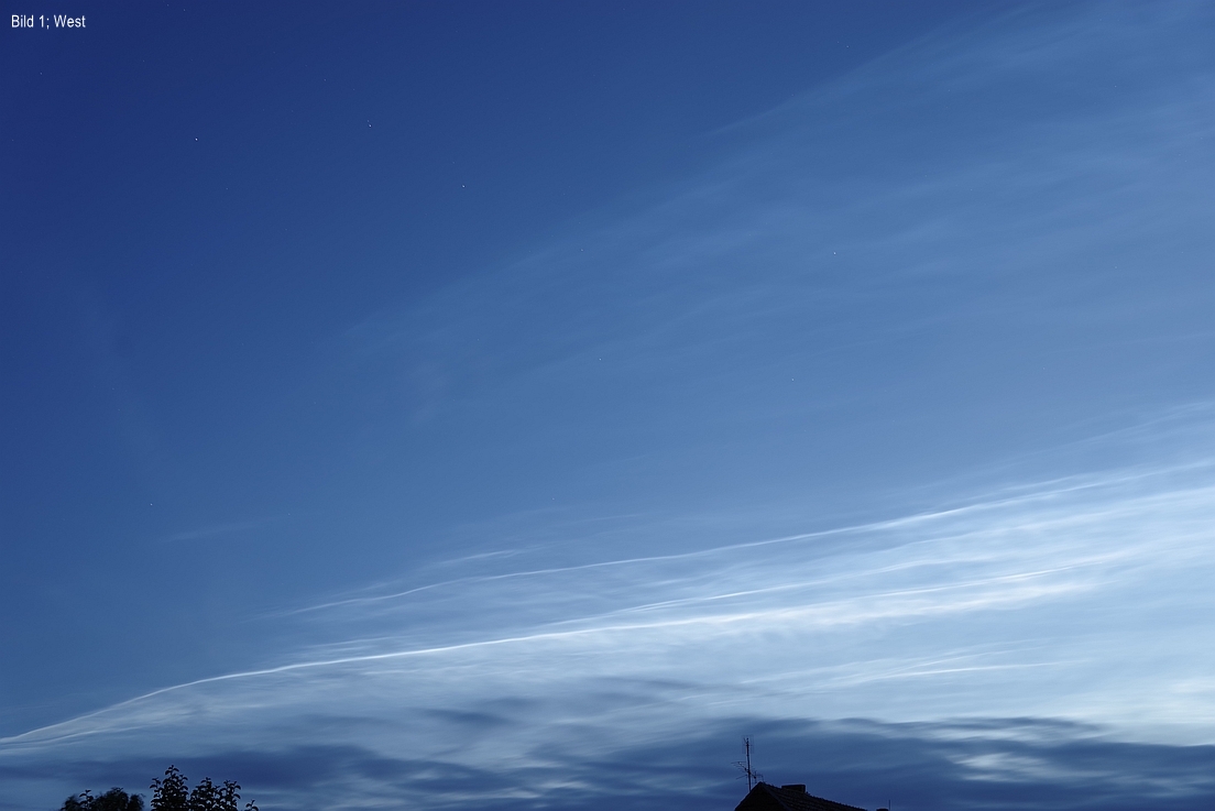 Dass die NLCs zu diesem Zeitpunkt bereits so präsent waren, ließ mich darauf schließen, hier später von noch helleren NLCs berichten zu können. Um etwa 23:25 MESZ war es dann soweit, NLCs der Helligkeit 3 waren sicher: