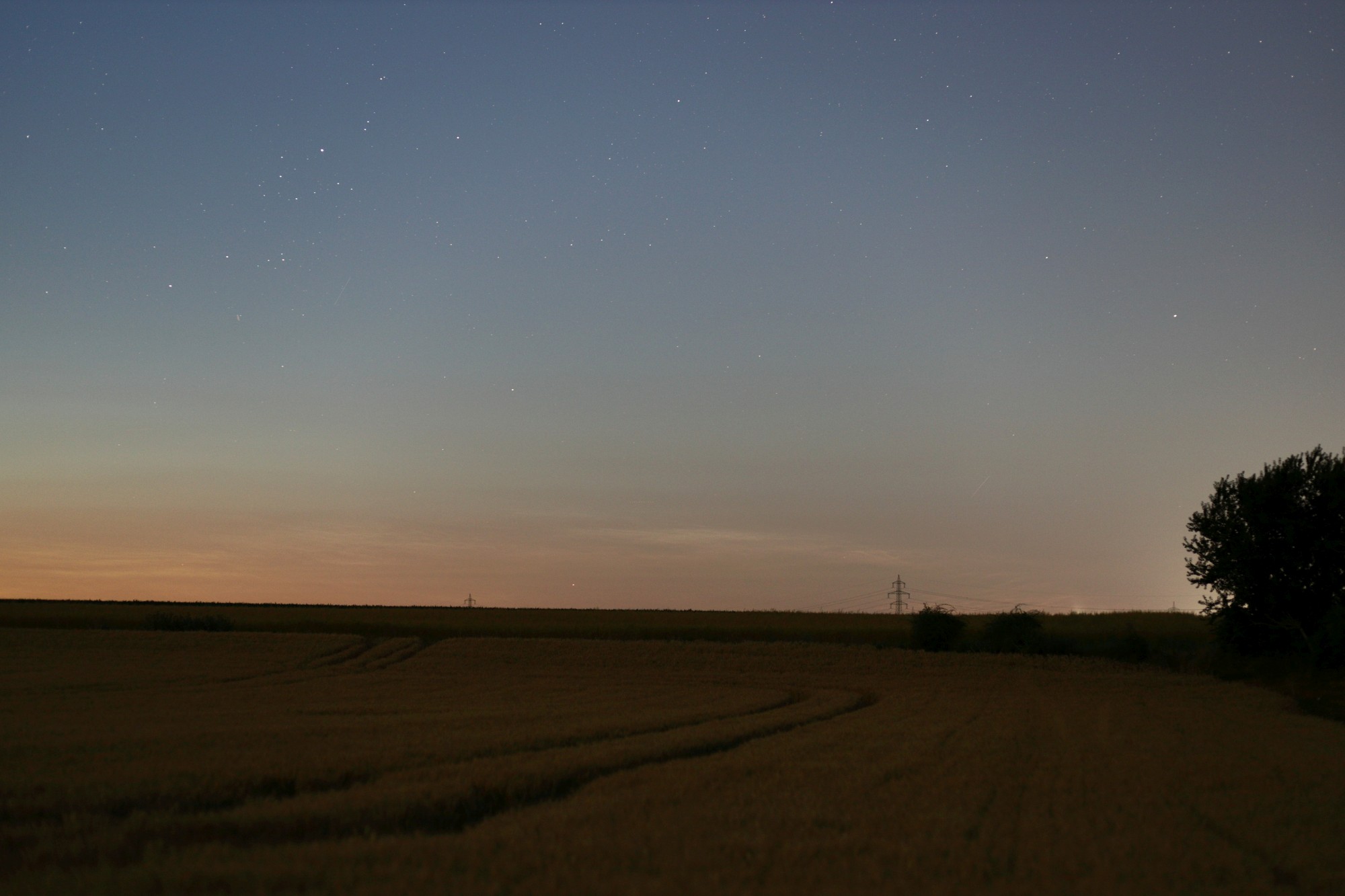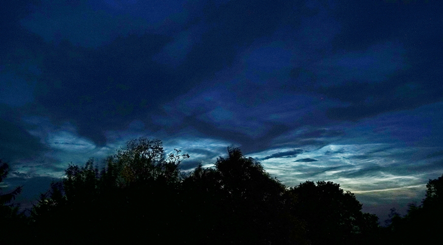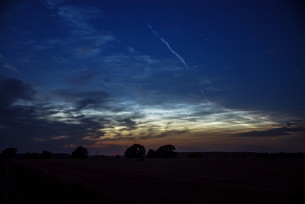 Der Himmel hatte sich gestern Abend leider zeitig komplett bewölkt. Ab etwa 22:30 Uhr MESZ gab es wie im Wetterbericht angekündigt urplötzlich starke Sturmböen. Nach 23:00 Uhr rissen dann immer mal ein paar kleinere "Schaufenster" auf, in denen sich im N-NO NLC zeigten. Die Ausdehnung des Feldes ließ sich allerdings leider nicht abschätzen.