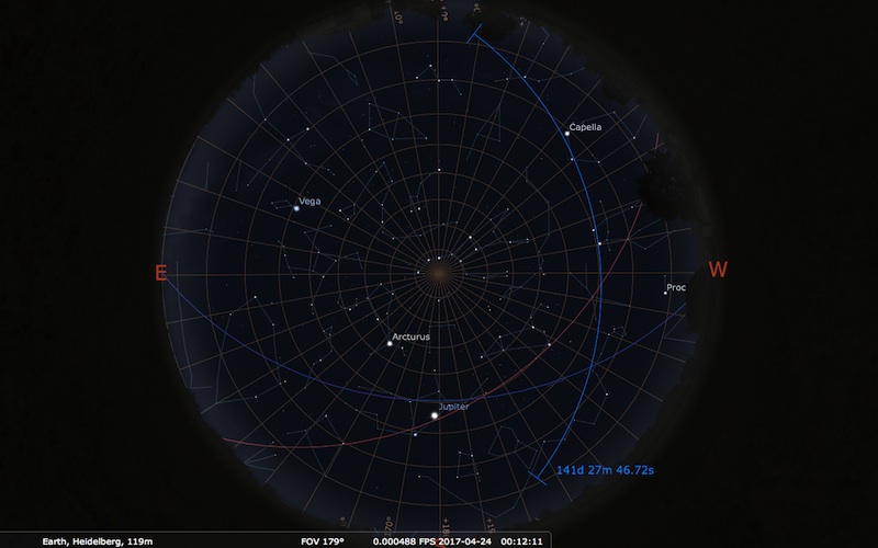 Rückverlängerung: Az. etwa 255°; Höhe etwa 40° (GEM/CNC: ca. 8h30m +20°; ecliptikal etwa 8:20m +0°, Lage des Antapexes = Sonne + 90°: 2h15m + 6h = 8h15m) (ach wie ist das mit stellarium alles so einfach!)