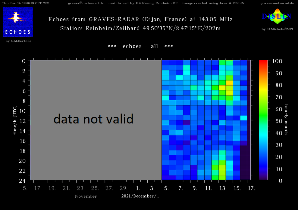 dankeschön, das sieht ja richtig gut aus. Ich beschäftige mich gerade mit dem Einbruch des Geminiden-Signals um Mitternacht herum. Da dein Signal dem der anderen Beobachter gleicht, kann der Unterschied zu meinem Signal nicht an der Discone liegen. Meine Vermutung war, dass die Umgebung etwas ungünstig ist. Aber es ist ja alles schön frei bei euch.
