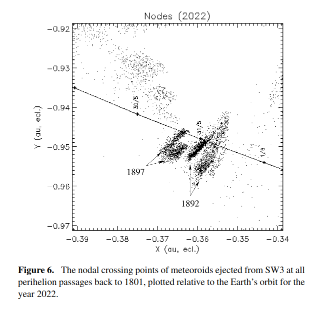 Immerhin stört der Mond nicht. Auch wenn die Zeitangaben der Modelle alle recht ähnlich sind (s. IMO-Kalender), sollte man die Vorhersage cum grano salis verstehen - es kann zu einem Sturm kommen, muss aber nicht, und es könnte auch in den Stunden oder Tagen vor oder nach dem genannten Zeitpunkt Aktivitätsspitzen auftreten. Ich hänge mal eine Abbildung aus Wiegert et al. 2005 an. Wie man sieht gibt es noch weitere, ältere Staubwolken, die von 1897 u. 1892, die eine Aktivität um den 31.5. herum erhoffen lassen: