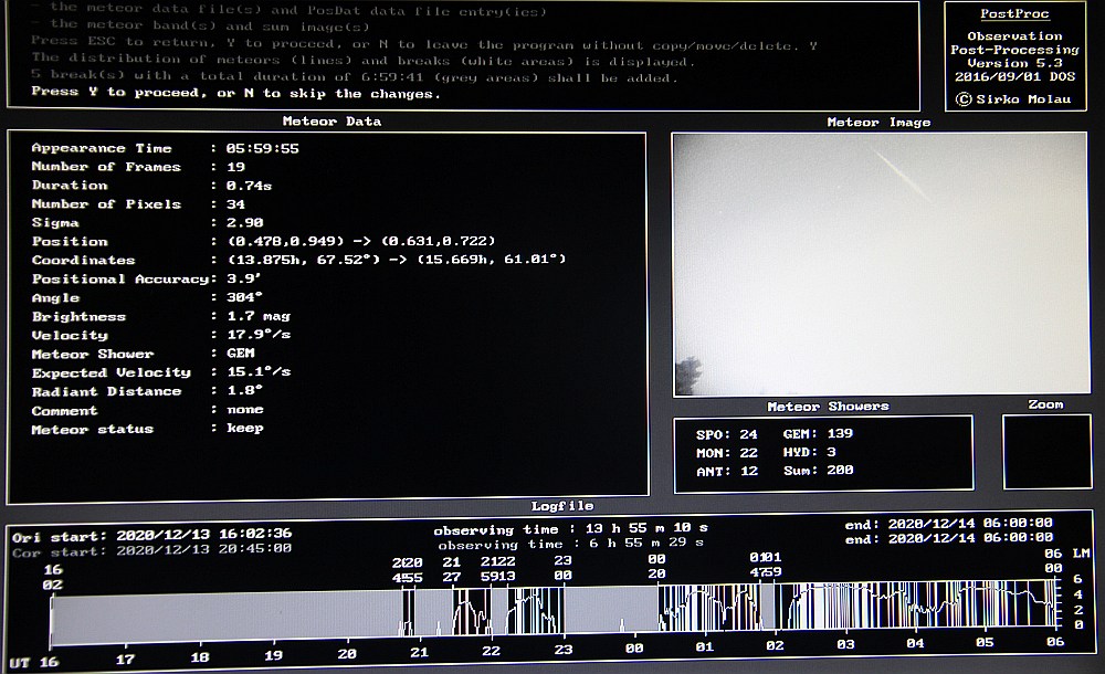 Dieses Jahr wird der Peak der GEM am 14.12. um 01:50 Uhr (MEZ) erreicht, was ideal für Deutschland und Mitteleuropa ist, auch deswegen weil der Radiant fast zur selben Zeit sein Höchststand erreicht! Zusätzlich ist am 14.12. Neumond (totale SoFi in Südamerika) was eine störlichtfreie Beobachtung ermöglicht, Zumindest wenn man sich ein dunkles Plätzchen außerhalb der Stadt sucht! Und dadurch, weil der Radiant mit Ende der Abenddämmerung aufgeht und am Ende der Nacht immer noch nicht untergegangen ist, wird die gesamte lange Nacht zum Beobachten einer meteorreichen Nacht lohnenswert sein…!