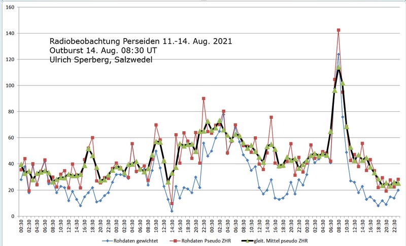auch meine Echos von GRAVES zeigen ein Maximum am Morgen des 14.08.2021 kurz nach 8 Uhr (UT). Da meine Aufzeichnungen in der darauffolgenden Nacht aufgrund einer 'Dusselei' für einige Stunden eine Lücke aufwiesen, traute ich mich bisher nicht, das Diagramm hier zu präsentieren ... Die Rohdaten (screenshots) wurden von mir bisher nur teilweise nach Fake-Echos durchgesehen.