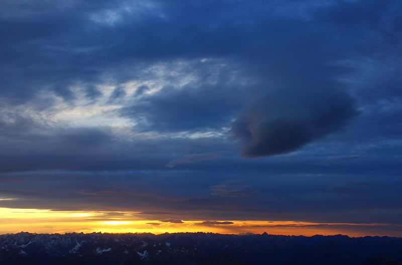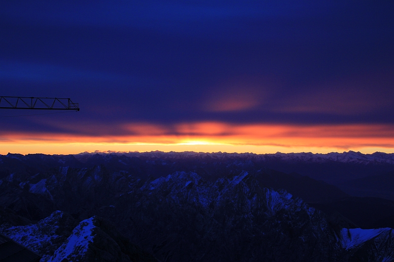 Auch der Sonnenuntergang am 5.11. war schön, aber nicht außergewöhnlich. Die Höhepunkte waren Alpenglühen und der Zugspitzschatten über dem Wendelstein. Leider störte nerviger Kran "meinen" Wendelsteinblick, der die nächsten zwei Jahre wegen Bau einer neuen Seilbahn da oben steht. Man muß sie Ausschnitte ganz schön minimierenn, um ihn auszublenden...