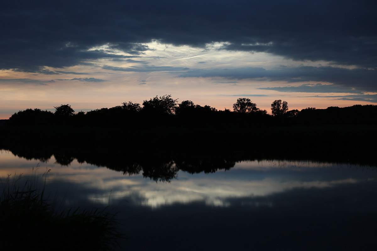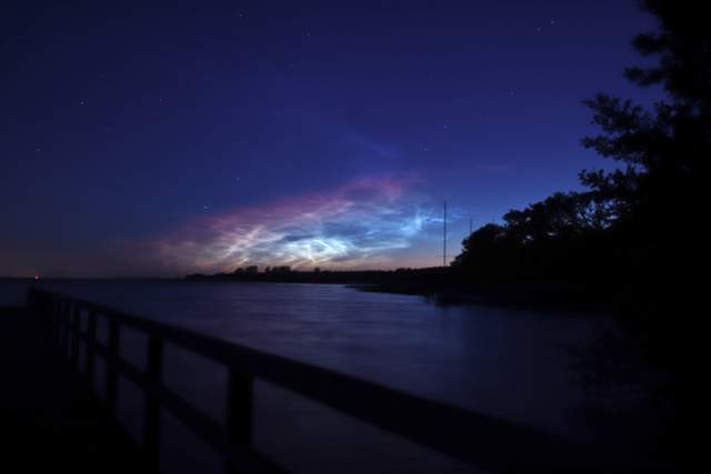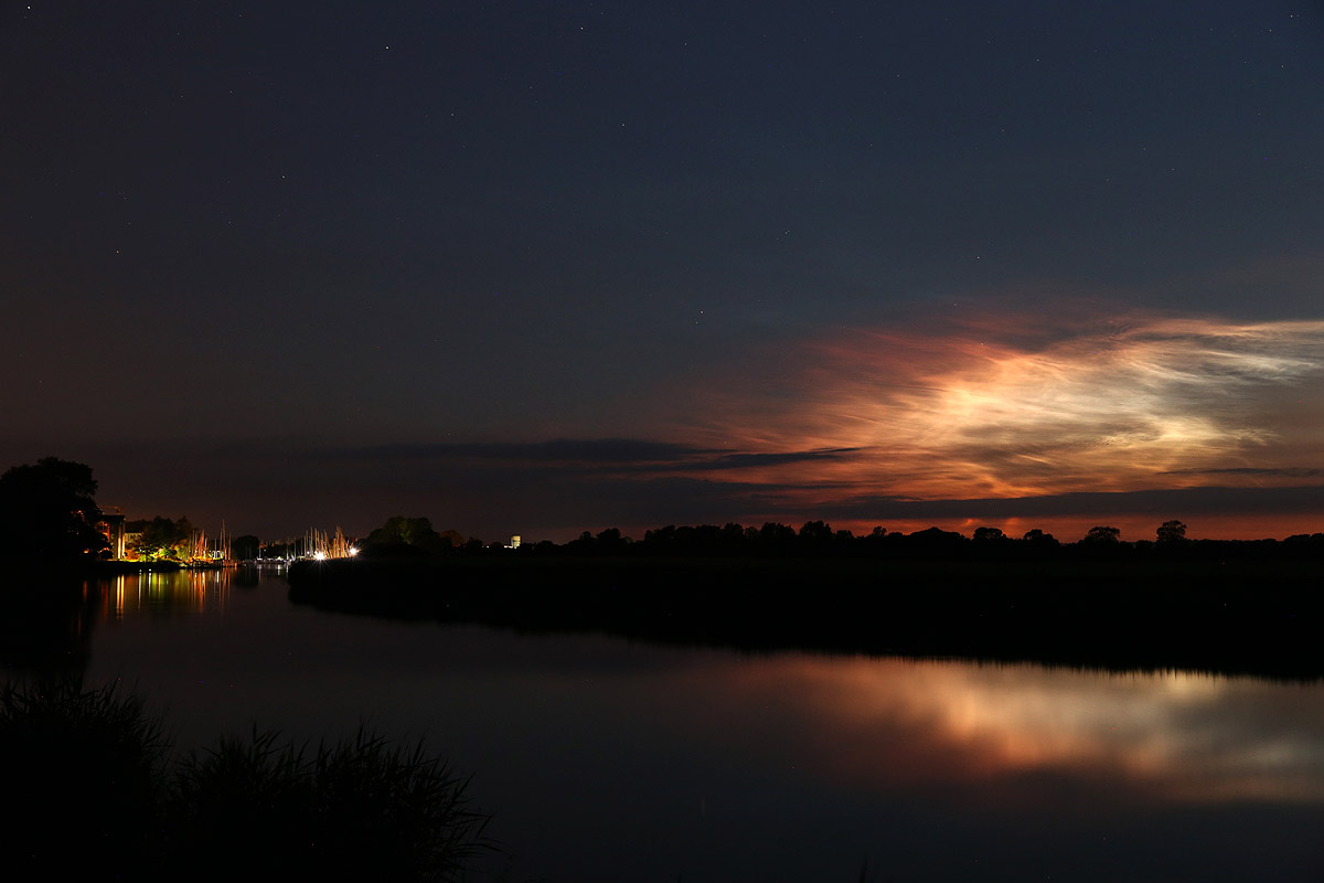 Im Internet konnte ich dann auch schon von großen Displays weiter südlich in Deutschland lesen, was meine Vermutung bestätigte, das es sich hier tatsächlich um NLC handelte. Ich zog mich also unerwartet schnell an und radelte eilig zum Ryck, weil das der nächst gelegene Ort mit freiem Blick nach West, Nord und Ost ist. Auf der kurzen Fahrt konnte ich in Wolkenlücken über mir die NLC gut und eindeutig erkennen, aber als ich dann am Ryck ankam, war von den NLC nichts mehr zu sehen oder zu fotografieren, die letzten Lücken in den Wolken hatten sich komplett geschlossen.