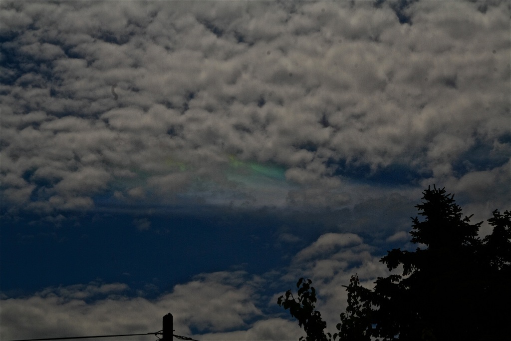Durch eine Wolkenlücke von Ac str per sah ich im Süden aus dem Küchenfenster schauend einen grünlichen Schimmer und ahnte, dass es sich um einen ZHB handeln müsse, es war fast schon 13h MESZ. Ich schnappte die Kamera und raste raus, in der Lücke ereigneten sich noch eine Wechselspiele des gesamten Farbspektrums. Von SW her zog dann ein langgezogener Cirrus auf und dieser geriet ins Einflussgebiet, zeigte sich zunächst an seinem unterem Ende gen Süden sehr intensiv in allen Farben und später gegen 13:20h zeigte sich am oberen Ende dieser Cirrusbank dann der ZHB für wenige Sekunden.