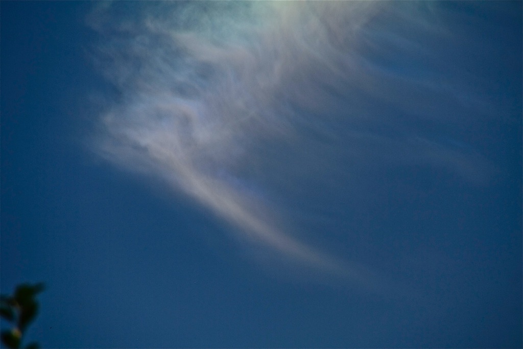 dieses Fragment habe ich auf dem dritten Bild von Oben nochmals vereinzelt und vergrößert, es zeigte das gesamte Farbspektrum sehr intensiv und deutlich, ein paar Minuten später zeigte sich nur mehr der Blauanteil, es hatte aber nichts mit dem weiter oben deutlichem Halbrund des ZHB zu tun. Deshalb die Frage, denn es zeigte sich an anderen Cirren in Sonnennähe nicht, immer nur an dieser Stelle. Wo zuvor eine halbe Stunde früher auch ein anderer Cirrus durch ist und irisierte. Der ist auf dem Anhang zu sehen. Hier nochmals ein paar Bilder von diesem Einzelfragment links unerhalb des ZHB.