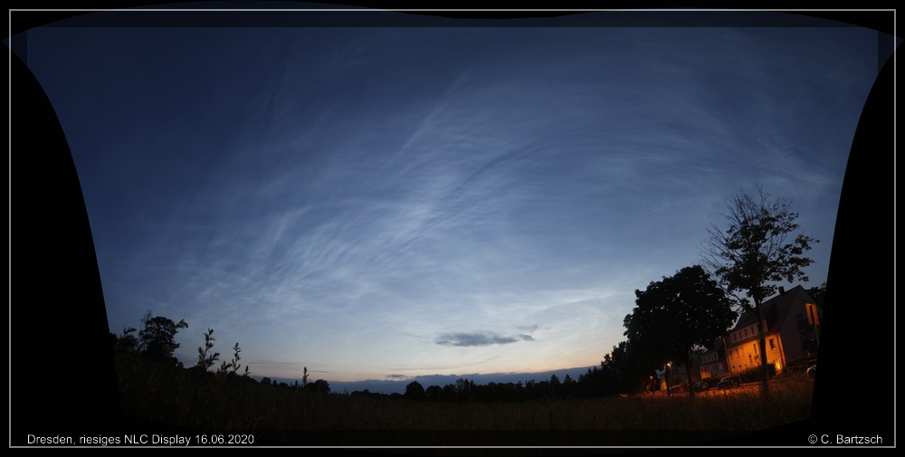 einfach nur verrückt. Bereits 22:00 Uhr sah ich sehr verdächtige NLC Strukturen in der hellen Dämmerung, so dass ich sofort zur Wohnung geradelt bin, um meine Kamera zu holen. Das Verdachtsfoto um 22:00 Uhr hatte ich noch schnell mit meinem Handy aufgenommen. Auf dem Platz angekommen, staunte ich nicht schlecht. Das NLC Display erreichte hier in Dresden zwischen 22:16 Uhr und 22:20 Uhr die maximale südliche Ausdehnung, die bis in den Zenit sichtbar war (Horizontale Ausdehnung von 240°W bis min. 40°O). Bereits nach 20-30 min. schrumpfte das Display auf etwa der halben Höhe. Für mich war es Helligkeitsskala 4. Ich musste in der Zeit mit meiner Canon EOS 1300D + 10mm Weitwinkelobjektiv Panoramabilder in Hochkantstellung á 5 Bilder aufnehmen, um überhaupt die gesamt Größe zu erfassen. Hier reichten schon 2 Sek. Belichtungszeit bei ISO 400 aus.