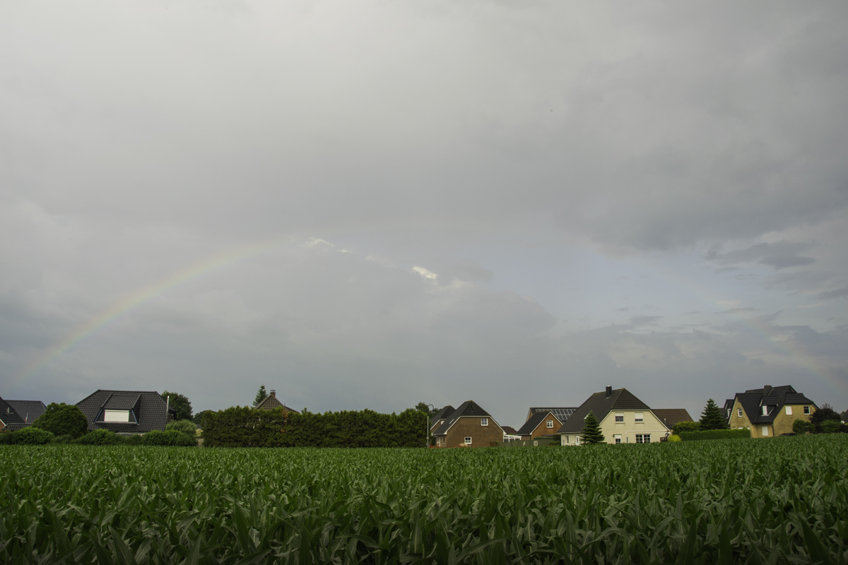 gestern, am 27.Juni gab es einen schönen Hauptregenbogen mit mindestens 4 Interferenzbögen, dazu einen Nebenregenbogen. Für ein oder zwei Minuten war der Hauptbogen sogar vor komplett blauen Himmel zu sehen.