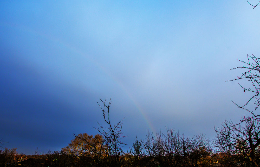 heute früh war bei leichtem Regen ein Hauch von Regenbogen über der Kleingartenanlage "Grönland" am Fuße des Volksparkes Prenzlauer Berg zu sehen.