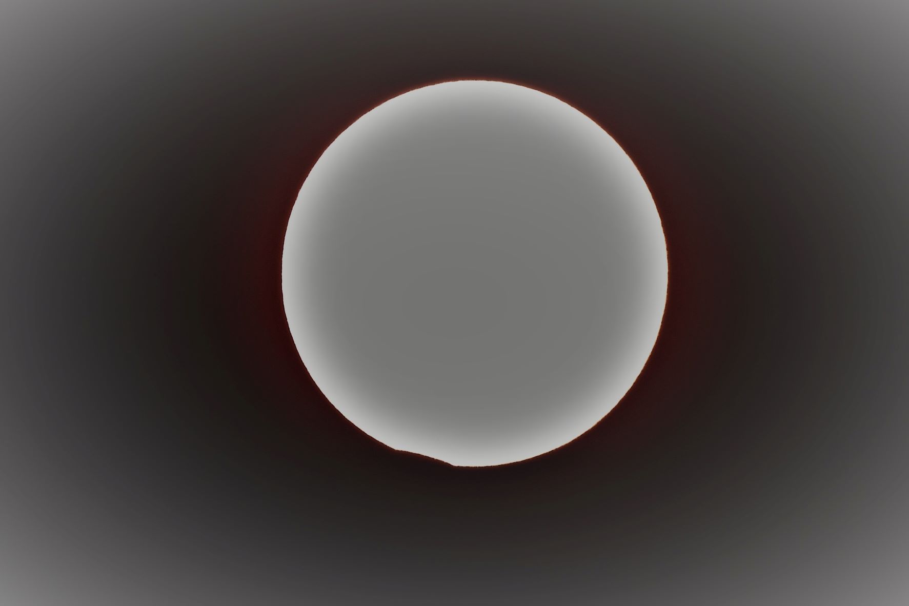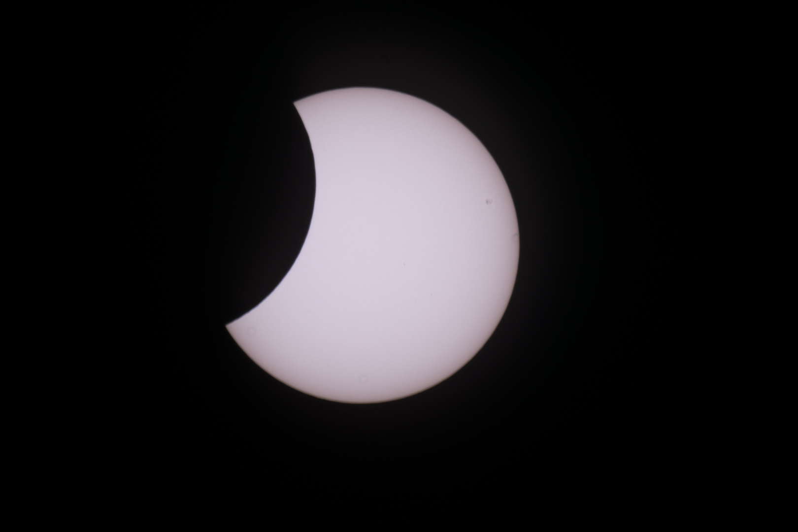 Wie an vielen anderen Orten war auch bei mir in Norddeutschland der Himmel lange komplett bedeckt. Erst kurz vor Maximum war die Sonne als undeutlicher Fleck durch die Wolken hindurch sichtbar. Erst kurz nach Maximum gelang dann die erste Sichtung und das erste Bild, wobei die Fokussierung wegen der weiterhin durchziehenden Wolken nicht gut war. Zum Ende hin waren nur noch dünne Schleier und Dunst über. Komplett klar war der Himmel nie.