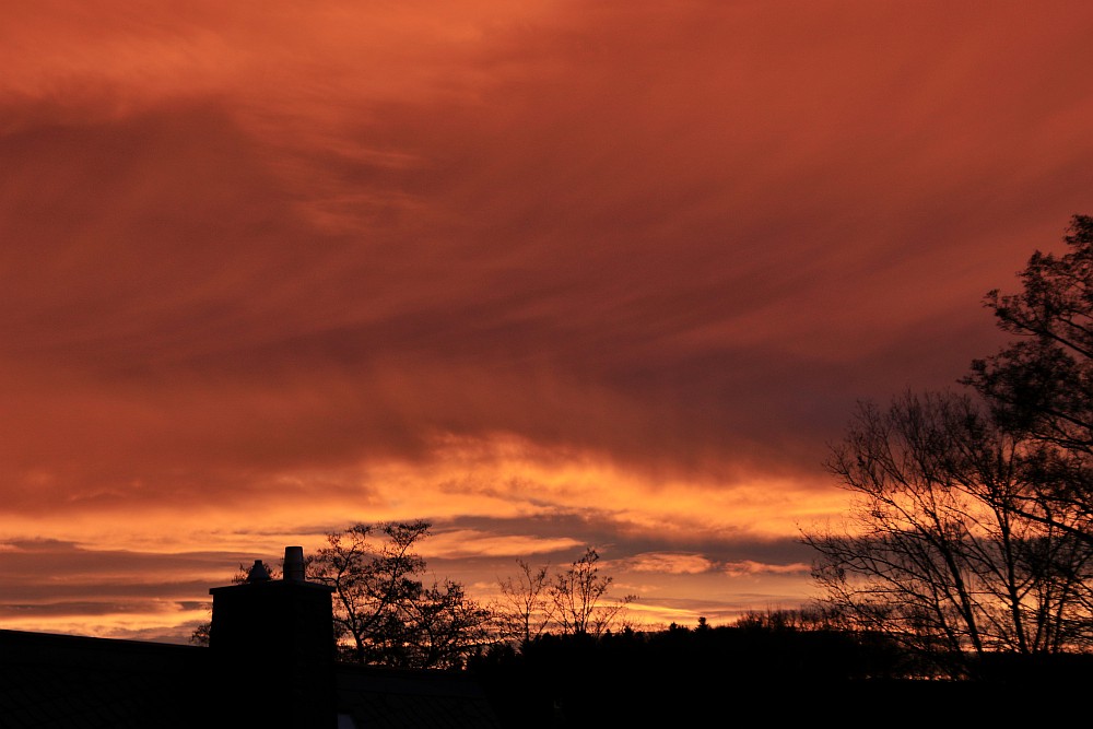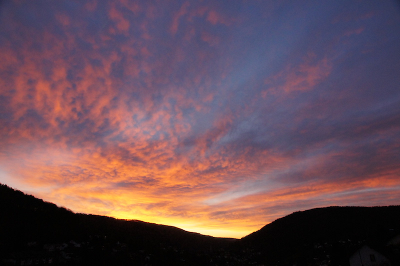Hier noch das Morgenrot vom 17.01. hier in Heidelberg. Zitweise zeigte sich auch eine Sonnensäule – entweder in Virga oder in Eisnebel, es waren keine Cirren vorhanden.