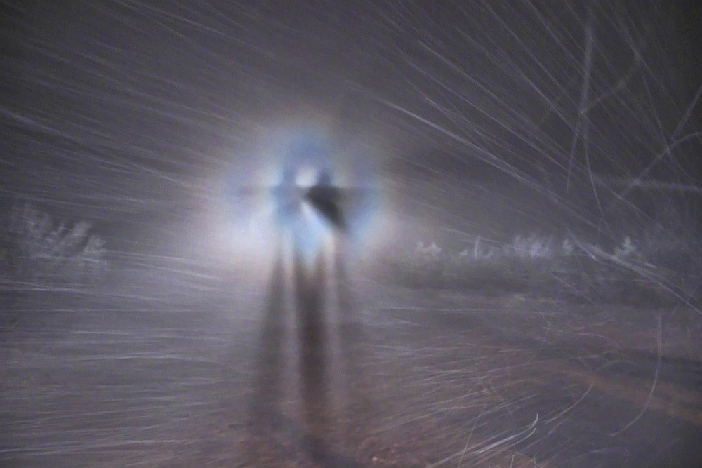 Künstliche an den Autoscheinwerfern erzeugte Brockengespenstzwillinge mit siamesischer Glorie auf dem Fichtelberg im Nebel und starken Schneefall