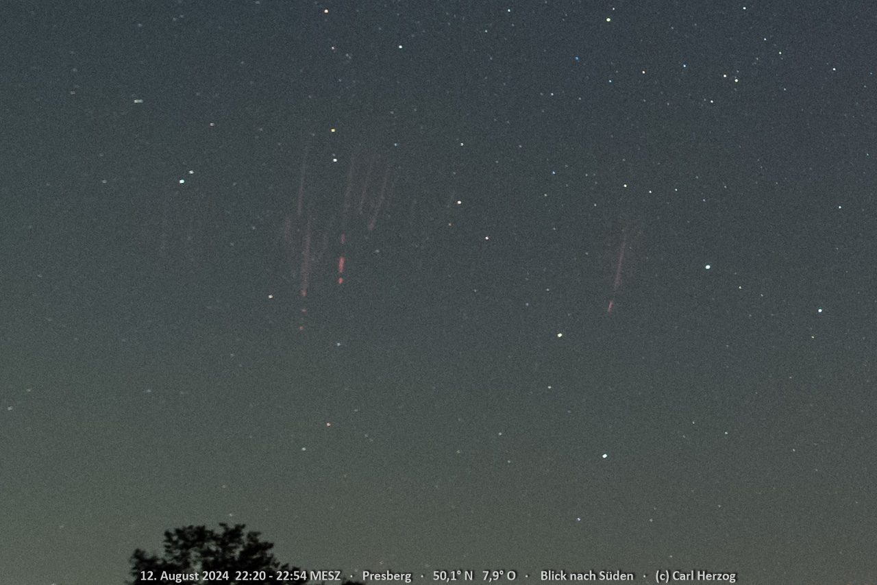 Die Aufnahmen entstanden in der Perseiden-/Polarlicht-Nacht mit einer astromodifzierten Kamera, und die Treffer waren ganz zufällig. Die Optik und die Einstellungen waren entsprechend suboptimal für Sprites (28mm, 4s, F2.2). Zur betreffenden Uhrzeit (22:20 bis 22:54 MESZ) gab es Gewitterwolken in weiter Entfernung, einmal gesichert im Norden, und zum anderen glaube ich auch im Süden (da haben ein paar Grad Horizontblick gefehlt, um es sicher sagen zu können, aber die DWD-App hat südlich von Karlsruhe was angezeigt, also mehr als 130 km Luftlinie).