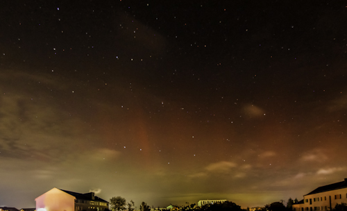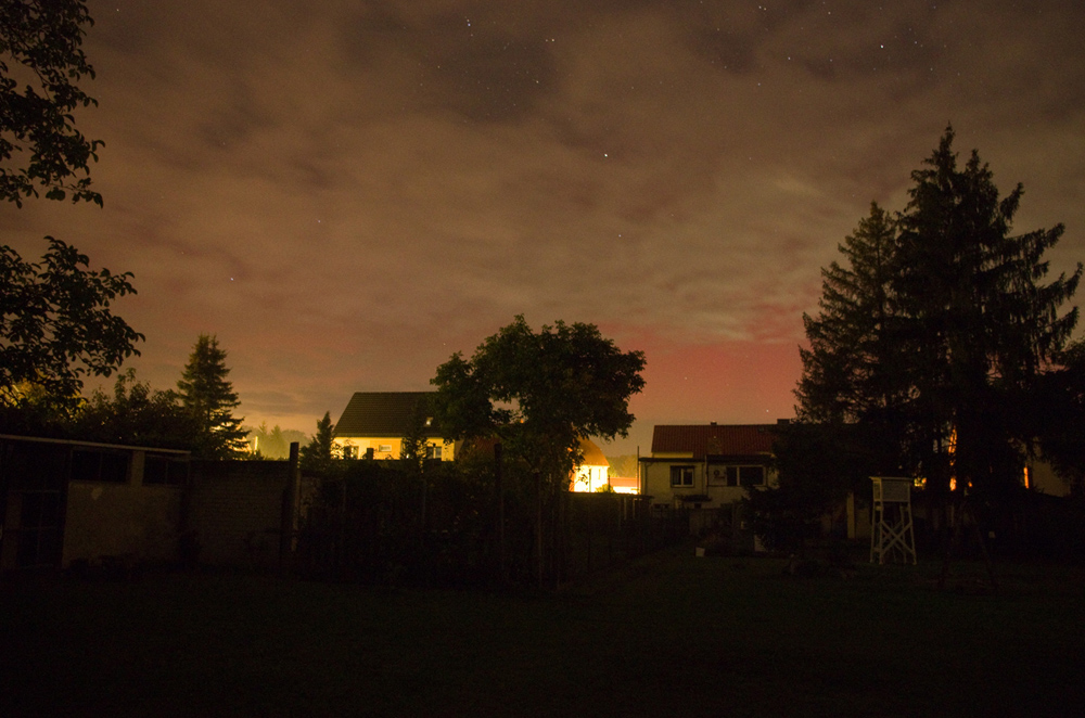 vor dem Schlafengehen gab es doch noch ein paar Wolkenlücken bei mir zuhause in Hörlitz (ca. 51.5° N / 14° N). Rotes Polarlicht war noch nachweisbar, nur fotografisch, 23:40-45 MESZ. Länger konnte ich nicht beobachten. Hier noch zwei Bilder, vom Dachboden (mit Straßenbeleuchtung!) und aus dem Garten:
