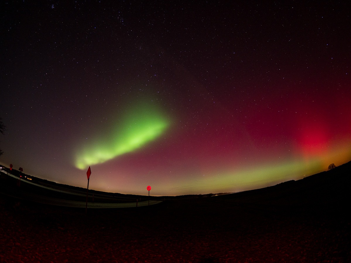 Im südlichen Kiel gelegen, habe ich normalerweise immer das Problem, dass die Stadt vor mir für Lichtverschmutzung sorgt, aber dieses Mal waren die Farben so deutlich zu sehen, wie ich es von meinen bisherigen Sichtungen so noch nicht erleben durfte. Um kurz nach 22 Uhr bin ich dann vor Aufregung schreiend aus dem Haus gerannt und habe dabei hoffentlich nicht zu viele Nachbarn erschreckt - der grüne Bogen waberte direkt über unserem Haus und war so sichtbar, wie ich es immer nur in Skandinavien erwartet habe zu sehen! Später zog es weiter und am südlichen Horizont pulsierte das Band stetig weiter bis ca. 23 Uhr. Wider Erwarten habe ich das sogar mit meiner Nikon filmen können, weil es so stark war.